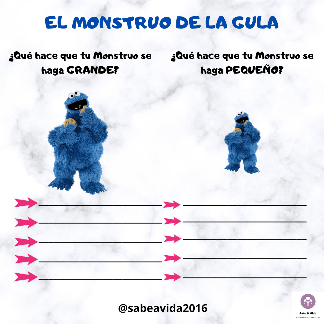 - El monstruo grande representa lo que potencia tu ansiedad, lo que la hace crecer. ¿Qué hace que tu monstruo se haga grande? ¿Qué te hace que comas más estos días? ¿Que te hace sentir ansiedad? tómate un momento para escucharte y haz una lista.