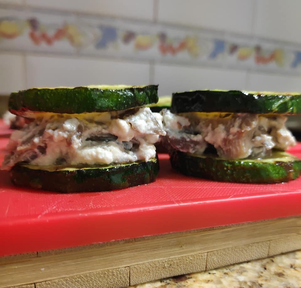 - De cada par de rodajas, poner relleno sobre una y tapar con la otra.