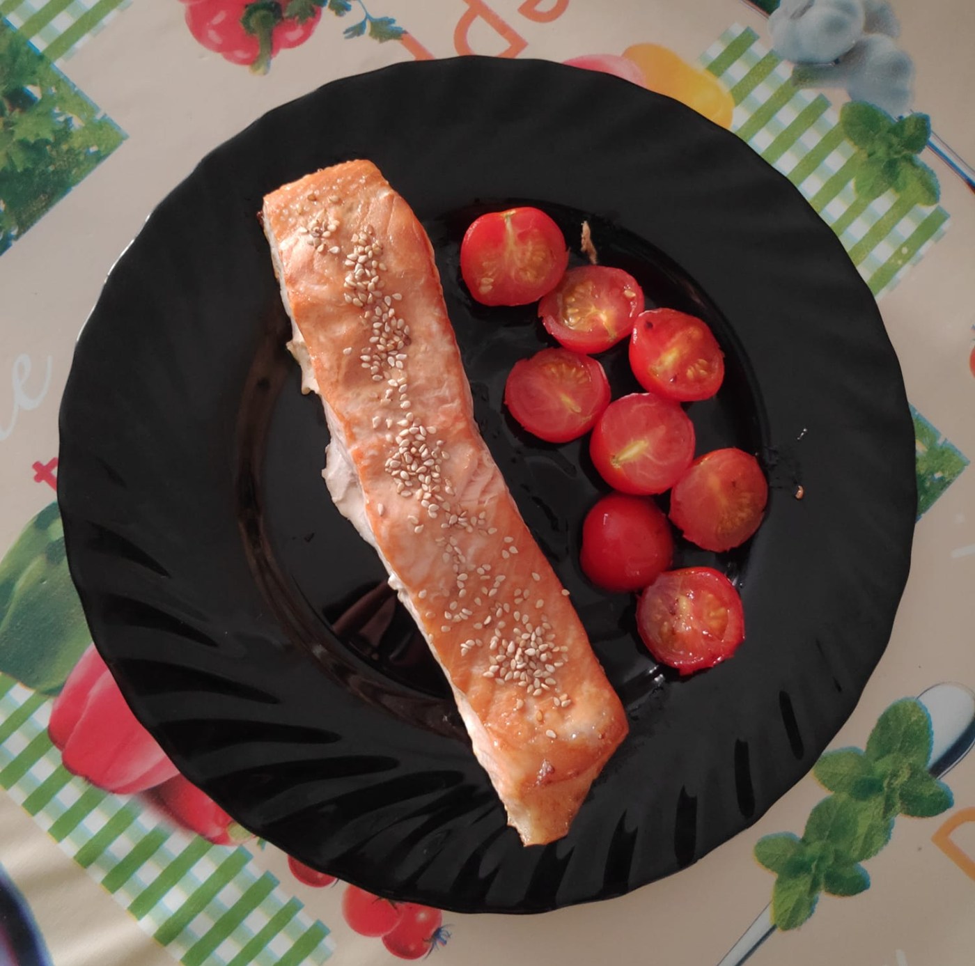 - Colocar el salmón en la bandeja y espolvorear por encima semillas de sésamo.