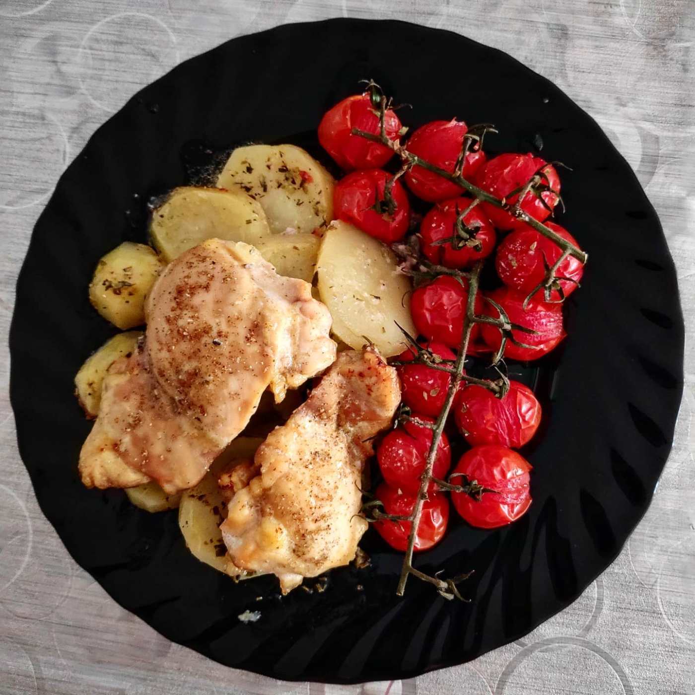 El plato está distribuido según el plato de Harvard: 1/4 plato proteína (pollo), 1/4 hidratos de carbono completos (patata) y la 1/2 tomate.
